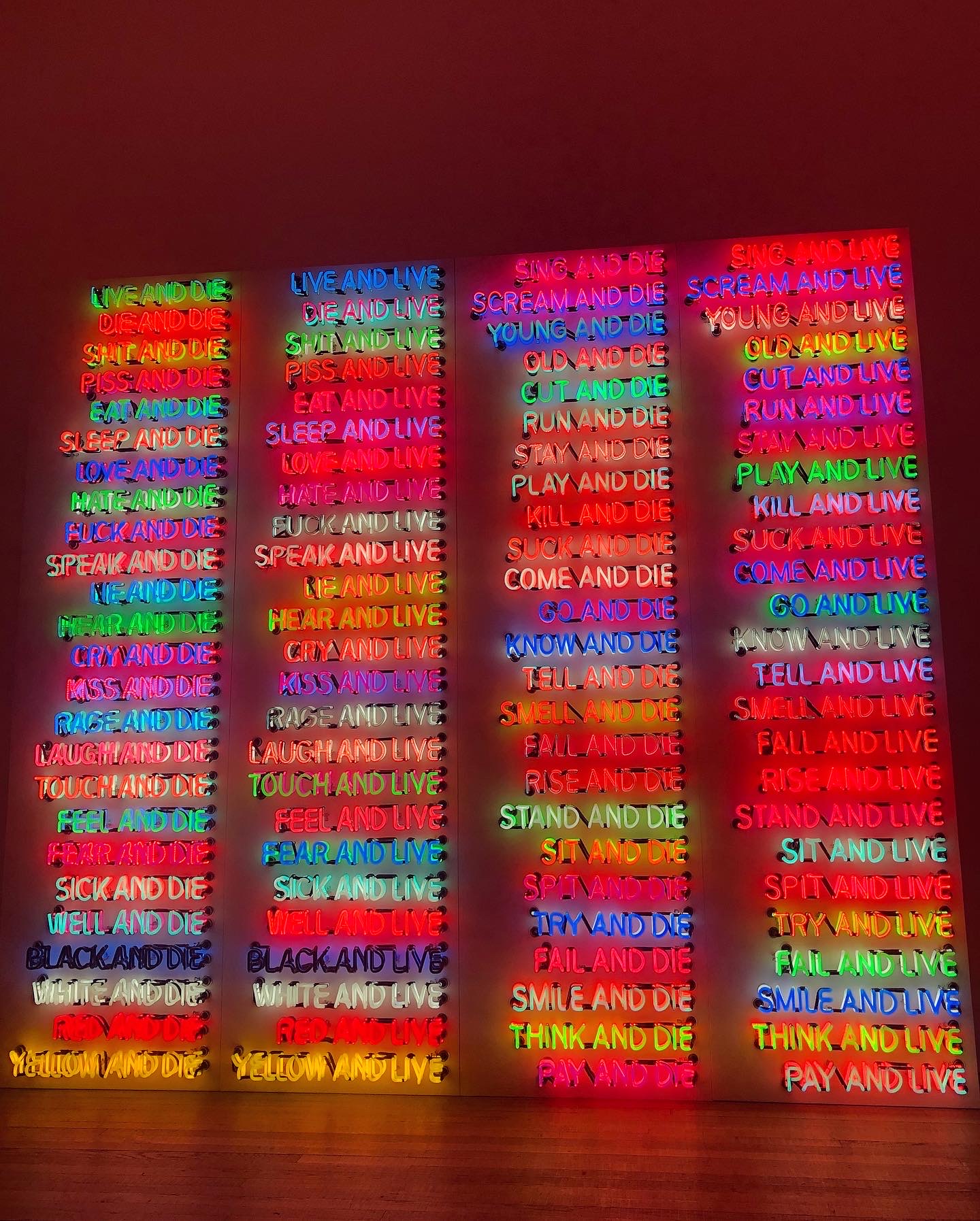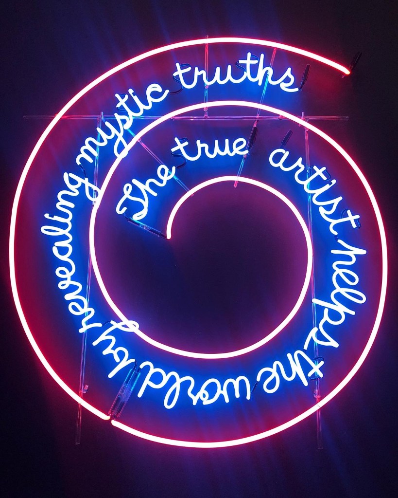 When you google or research Bruce Nauman’s he is famously known for his work depicted through aesthetically pleasing neon signs. Included below are his pieces ‘One Hundred Live And Die’ and ‘Human Nature/Knows Doesn’t Know’. ‘One Hundred Live And Die’, is a collection of neon news headlines that irregularly appear and reappear across the screen. This piece plays on the idea that individuals eventually become statistics rounded up to the nearest hundred. Nauman’s piece ‘Human Nature/Life Death/ Knows Doesn’t Know’, focuses more on the materiality of language itself. Forcing us to consider our own relationship with the speaker and other viewers in the gallery, through neon tubing. These pieces truly make you stop stare as you walk into the room they are displayed within. In return they stare back at you, imprinting their colourful message upon your soul. Every individual part of neon art is equally as mesmerising in its own way, and were some of my favourite parts of Bruce Naumans exhibition.